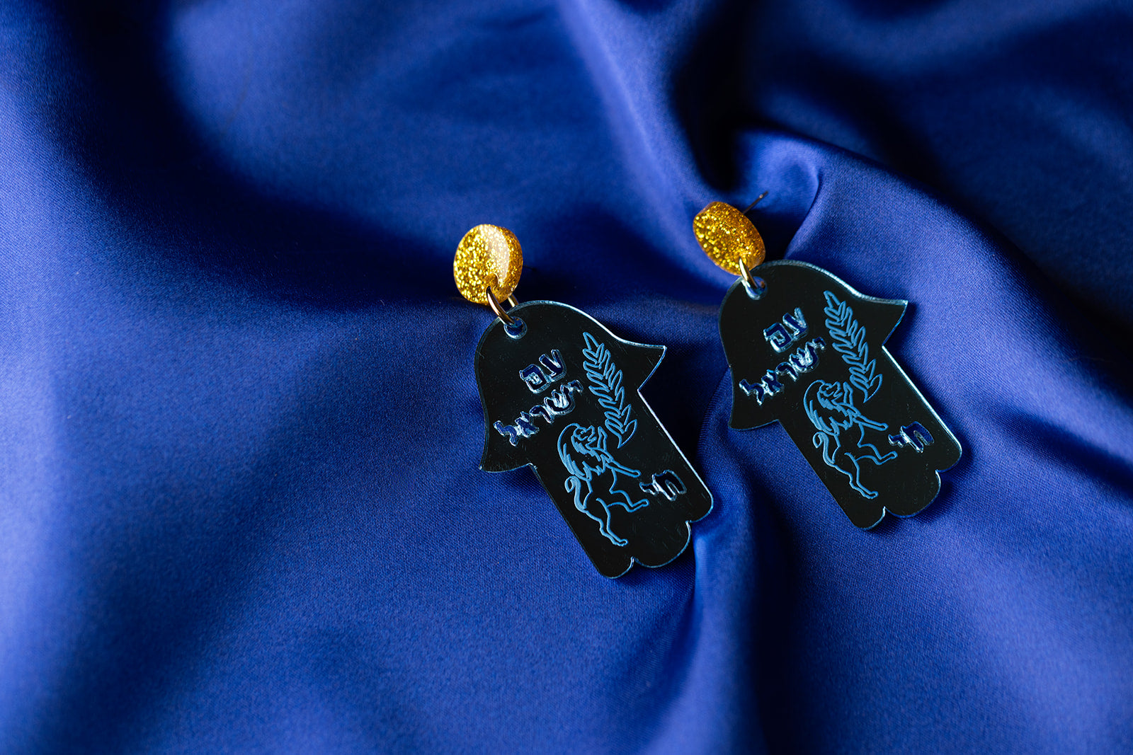 Make a bold statement with the Hadasah Hamsa Earrings! These eye-catching beauties feature a striking blue mirror acrylic base with an etched lion and olive branch, paired with a shimmering gold glitter acrylic top. The cutout phrase "Am Yisrael Chai" in Hebrew adds meaningful depth, while gold hardware completes the look. Perfect for anyone who wants to wear their pride and passion loud and proud.