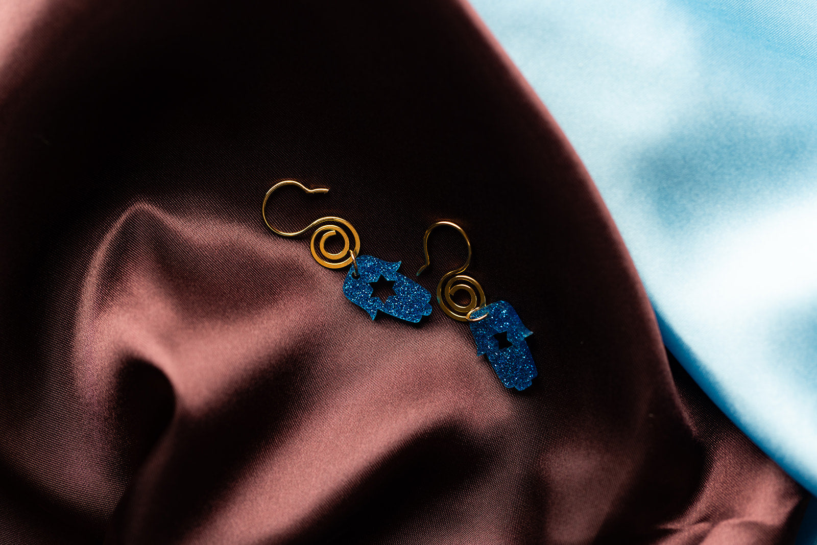 Meet our Danit earrings with our fan-favorite hamsa charm! These beauties showcase an acrylic hamsa motif with Jewish star cutout, suspended from retro-inspired wire hoop hardware that brings serious vintage vibes. Rendered in a heavenly blue glitter finish, they're the perfect blend of spiritual symbolism and fashion. A timeless piece that celebrates your heritage with style and shimmer!