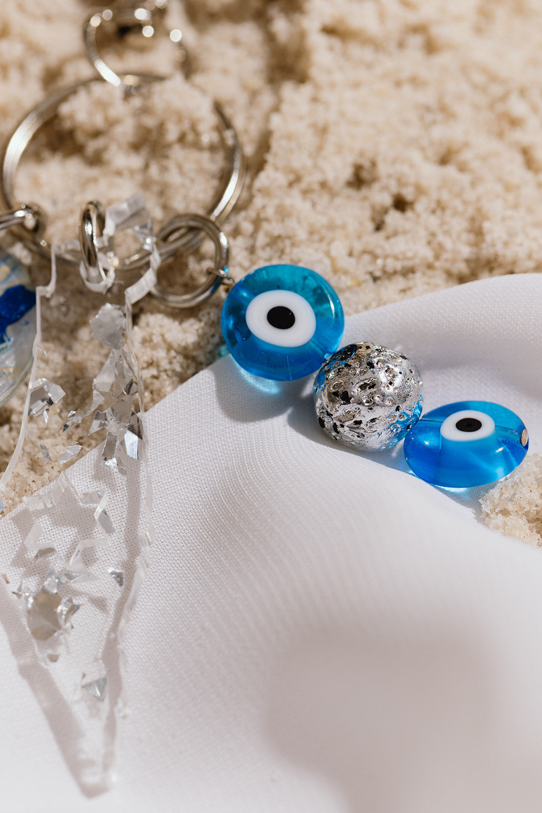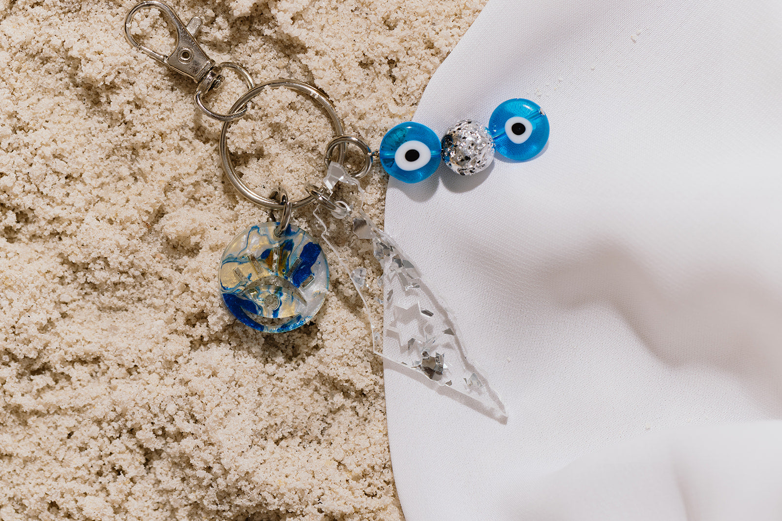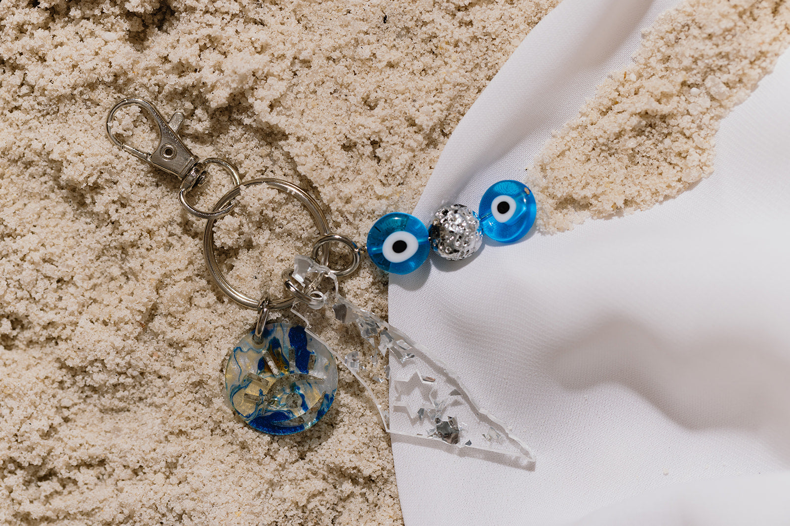 Celebrate your heritage with this stunning silver and blue Izzy Keychain. Featuring an Israel motif silver fleck acrylic charm with Jewish star cutout, paired with a blue marble evil eye medallion, this piece combines meaningful symbolism with eye-catching design. Adorned with glass evil eye beads and silver-plated lava bead accents, it's the perfect way to express your Zionist and Jewish pride.