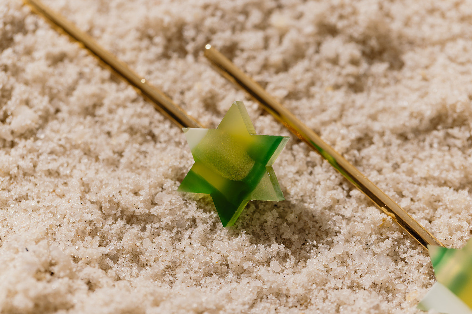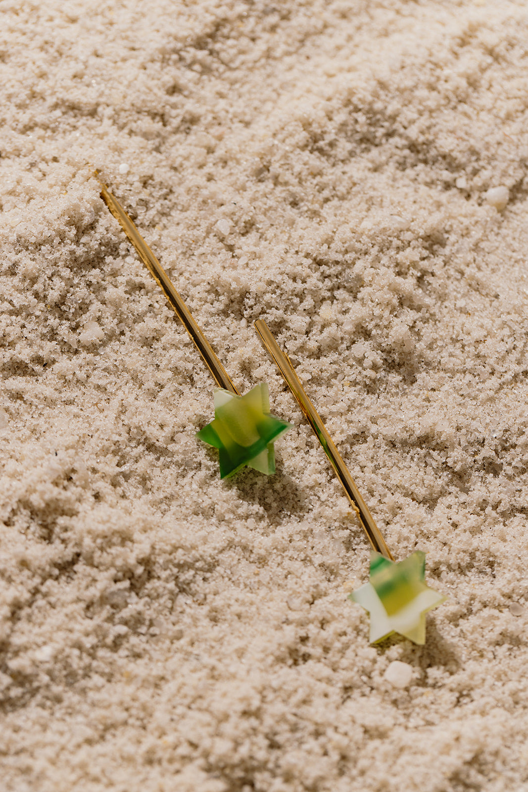 Celebrate your heritage with this charming hair pin set featuring two matching gold-plated pins adorned with Jewish stars in a tartan-inspired green acrylic. Perfect for securing curls with understated elegance, these handmade pins blend cultural pride with playful style.