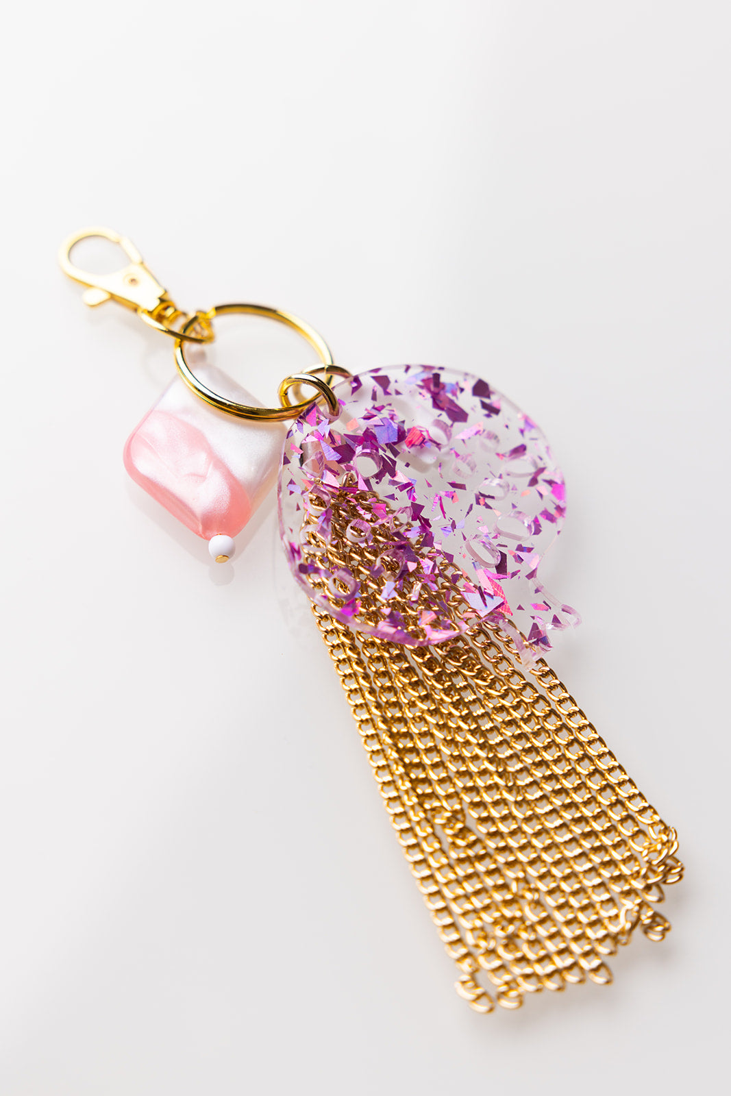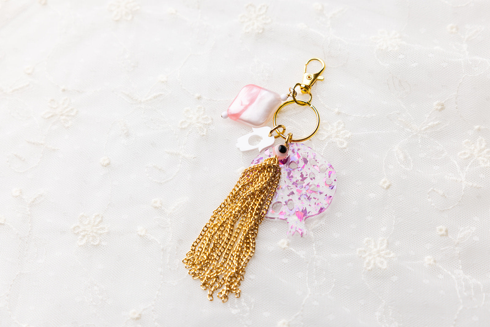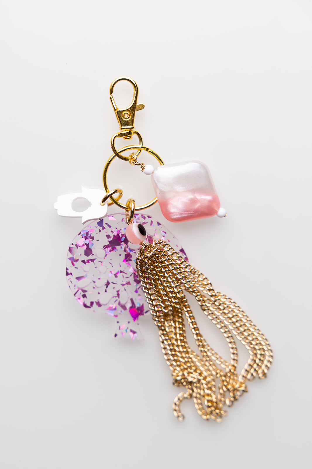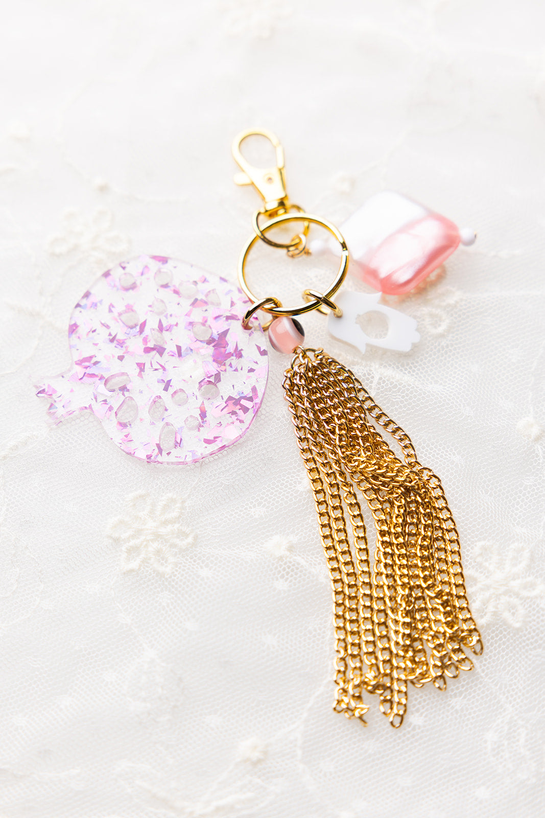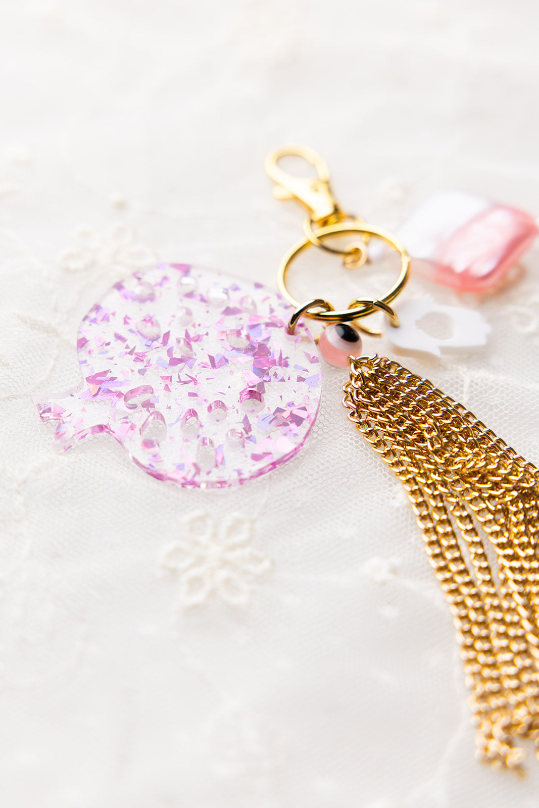 Add a playful touch to your style with the Leora Bag Charm & Key Chain. Featuring a large holographic pink fleck acrylic pomegranate charm, a tassel, a smaller hamsa charm, and beaded accents, this accessory lets you accessorize beyond jewelry while proudly celebrating your Jewish heritage. Perfect for bags or keys, it combines fun and beauty in one unique piece.