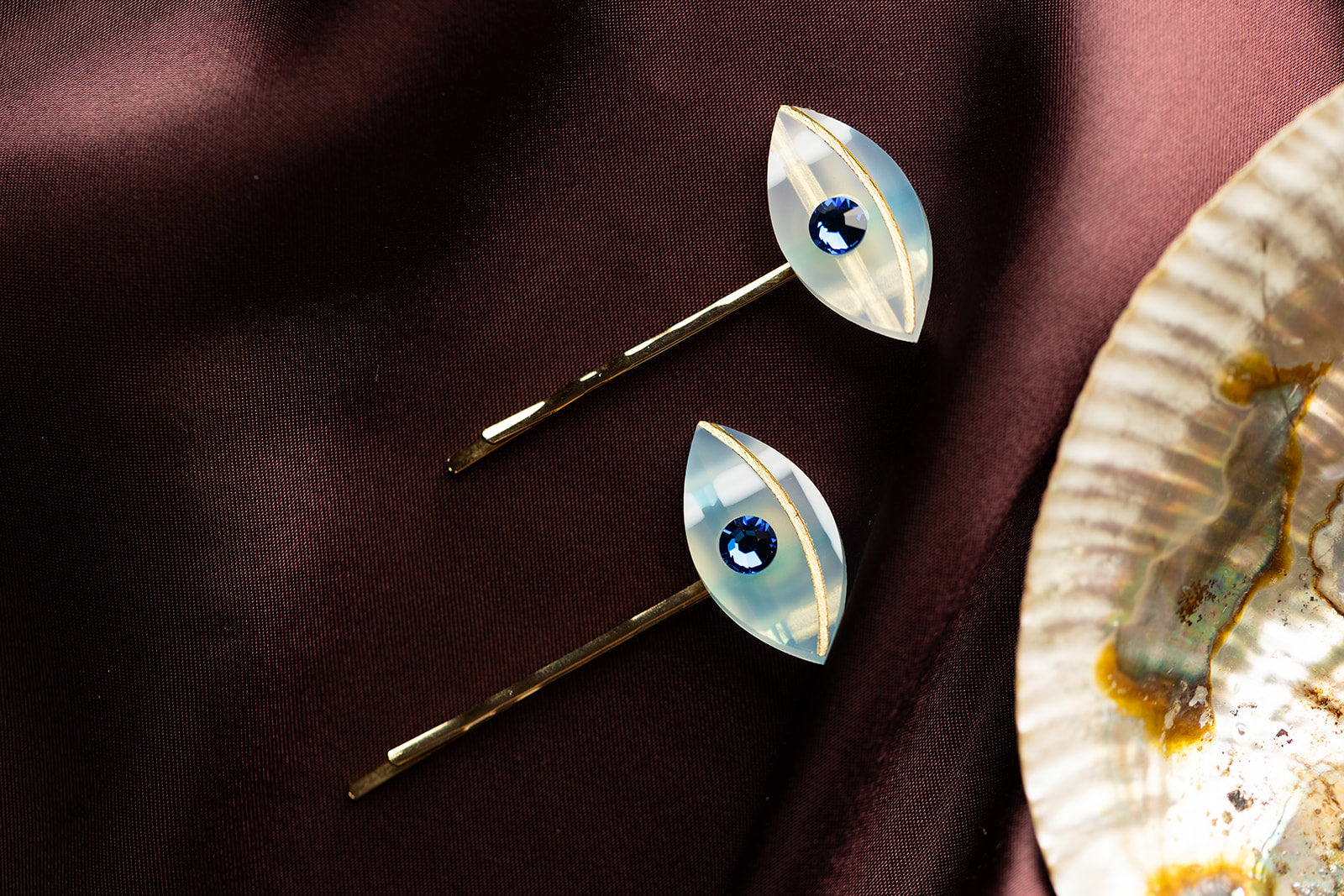 Keep your locks looking gorg with the Nessa Eye Hair Pin Set of two. This playful pair features enchanting eye designs in light blue plaid acrylic, each adorned with a brilliant blue Swarovski crystal and shimmering gold accents. No matter the hairstyle you decide to pair them with, these pins deliver both function and whimsy. Double the eyes, double the protection!