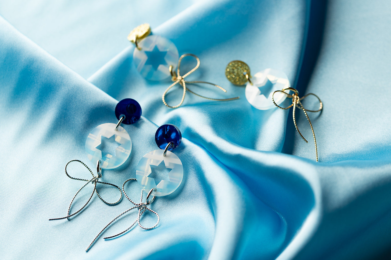 Judaica meets cutesy cottage core vibes with our Rivka bow earrings! These charming acrylic earrings feature a circular emblem design with a Jewish star cutout, crafted in soft light blue plaid acrylic with subtle shimmering gold accents. Each is paired with a very sweet bow hardware motif that adds a whimsical touch. Choose between silver or gold accent options to match your personal style.