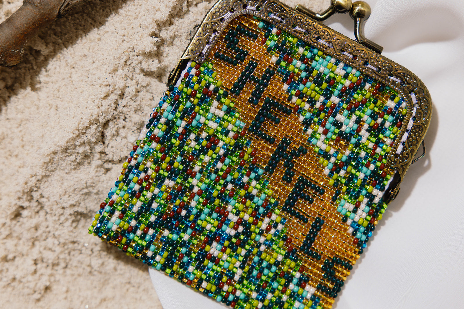Glass Seed Beads. Cotton Lining. Metal Closure.
