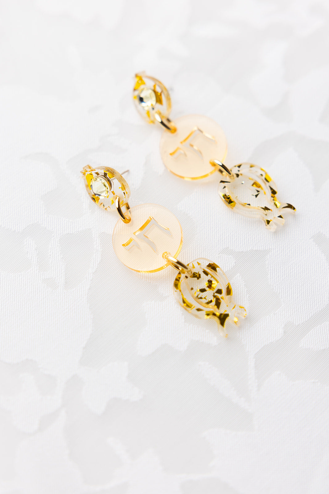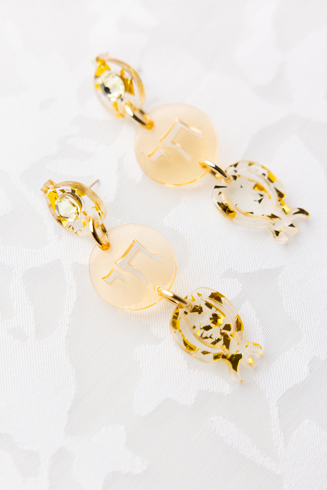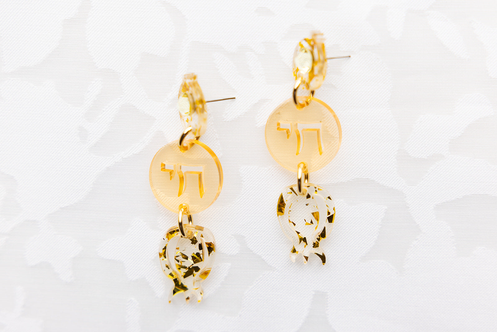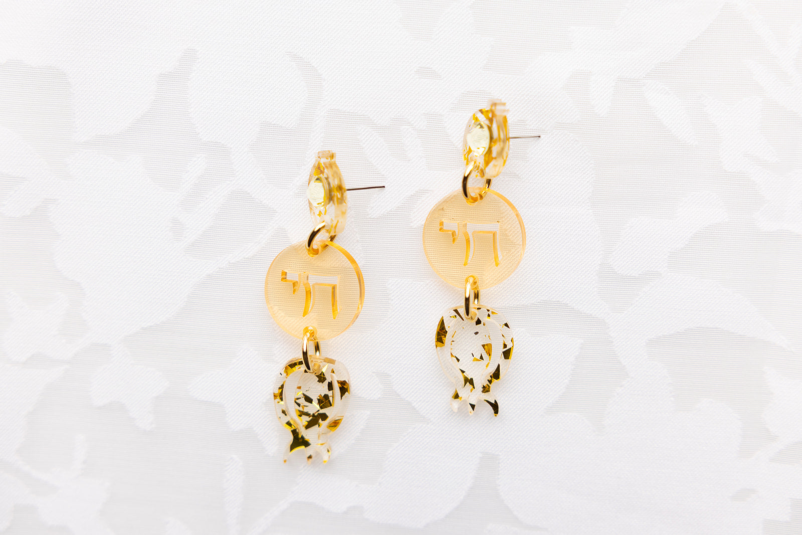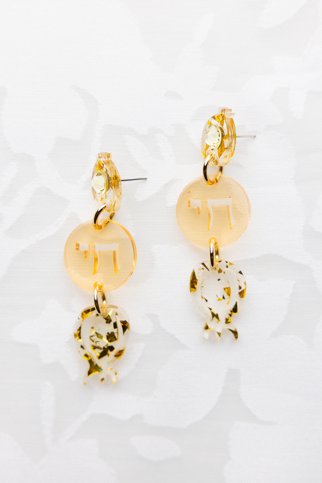These playful Shir earrings combines transparent honey colored acrylic with gold fleck acrylic for a fresh, modern look. Featuring pomegranate motifs alongside the Hebrew word "Chai," meaning life. They bring a joyful spirit to your style. Accented with sleek gold hardware and sparkling Swarovski crystal, these earrings add a touch of whimsy and tradition to any outfit.