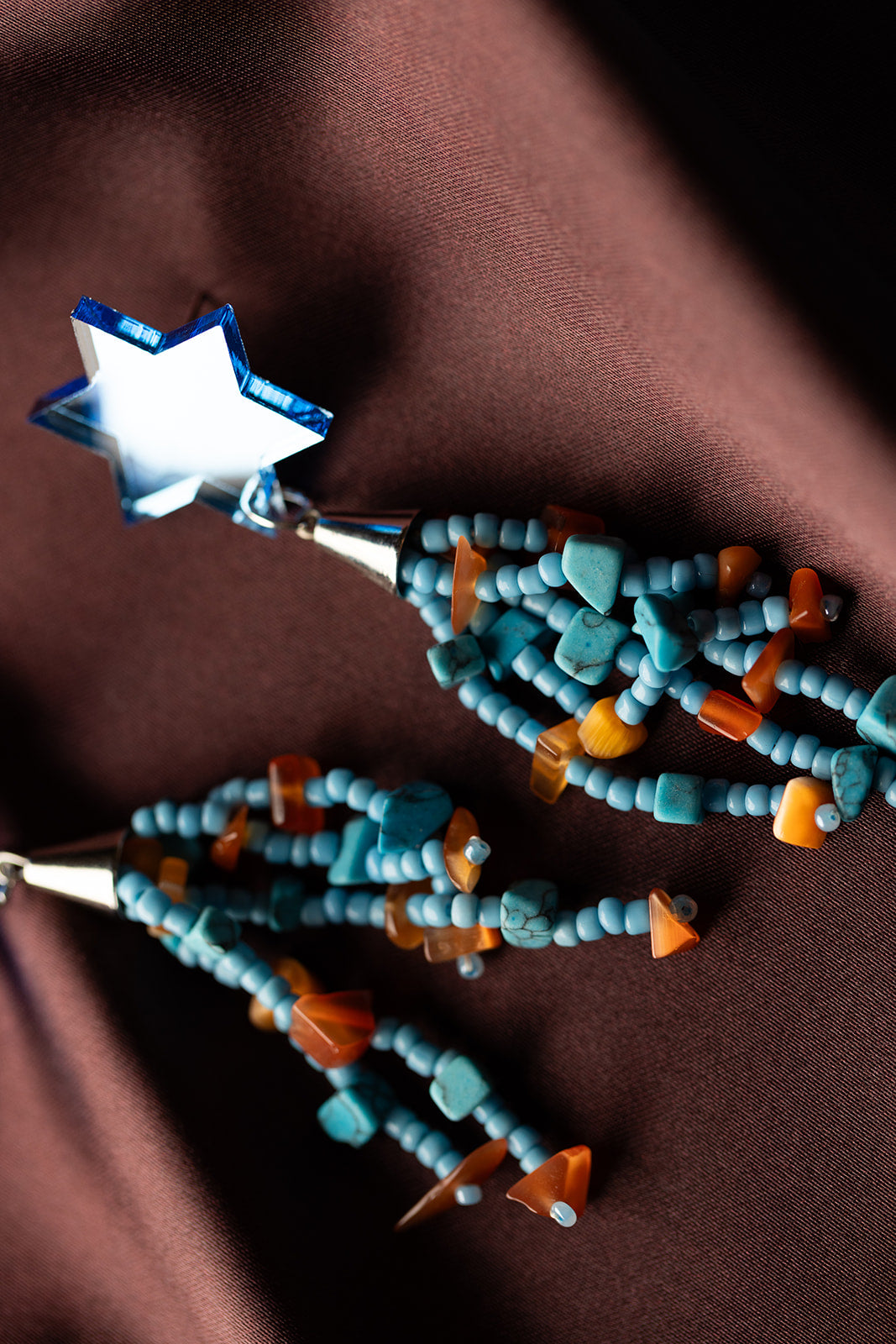 Make a statement with the Tova Fringe Earrings—a playful blend of eclectic charm and modern edge. These one-of-a-kind pieces feature authentic dead-stock beaded turquoise stone fringe that cascades beautifully, paired with striking blue mirror acrylic Star of David tops. Each earring tells a story of timeless style meets bold symbolism.