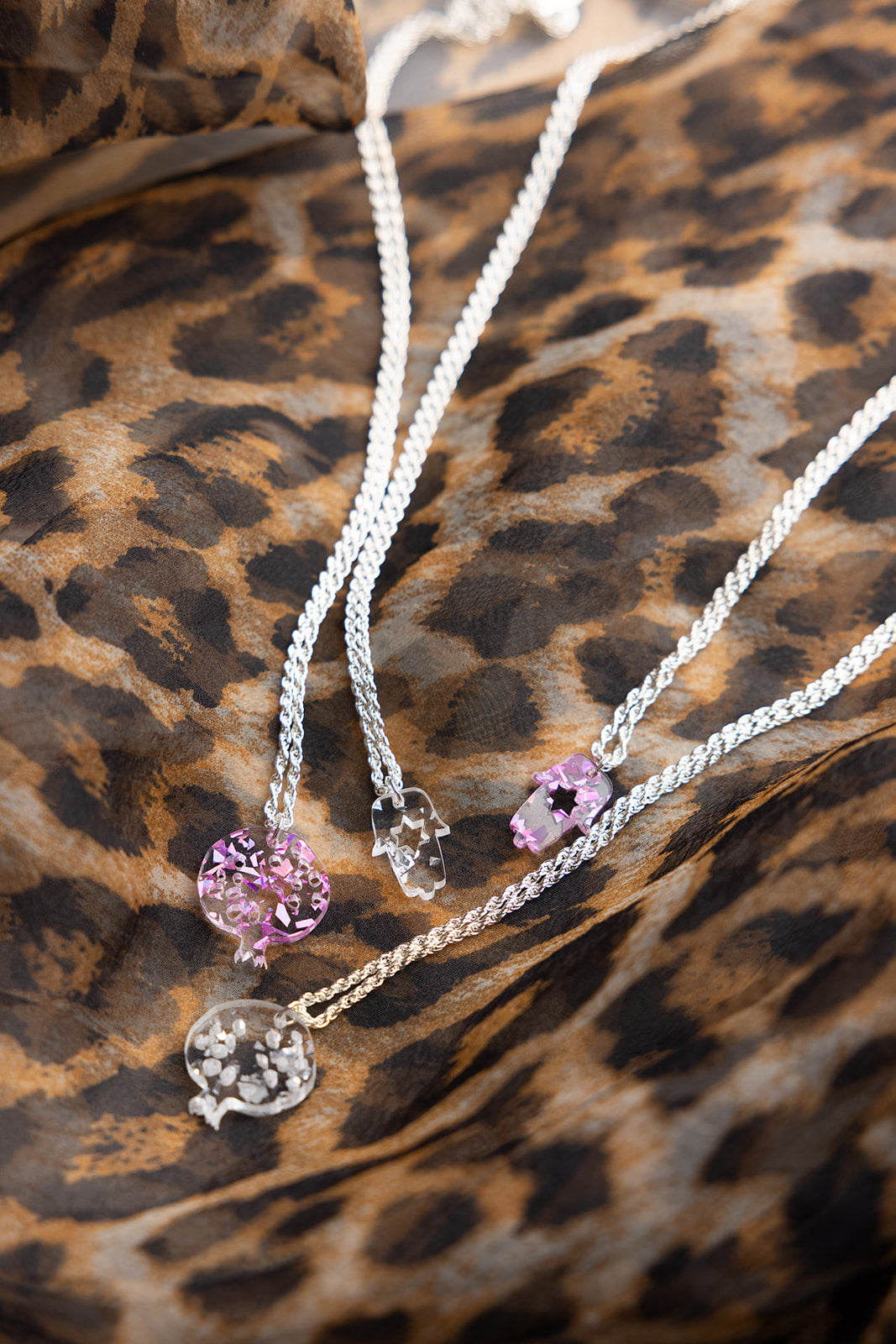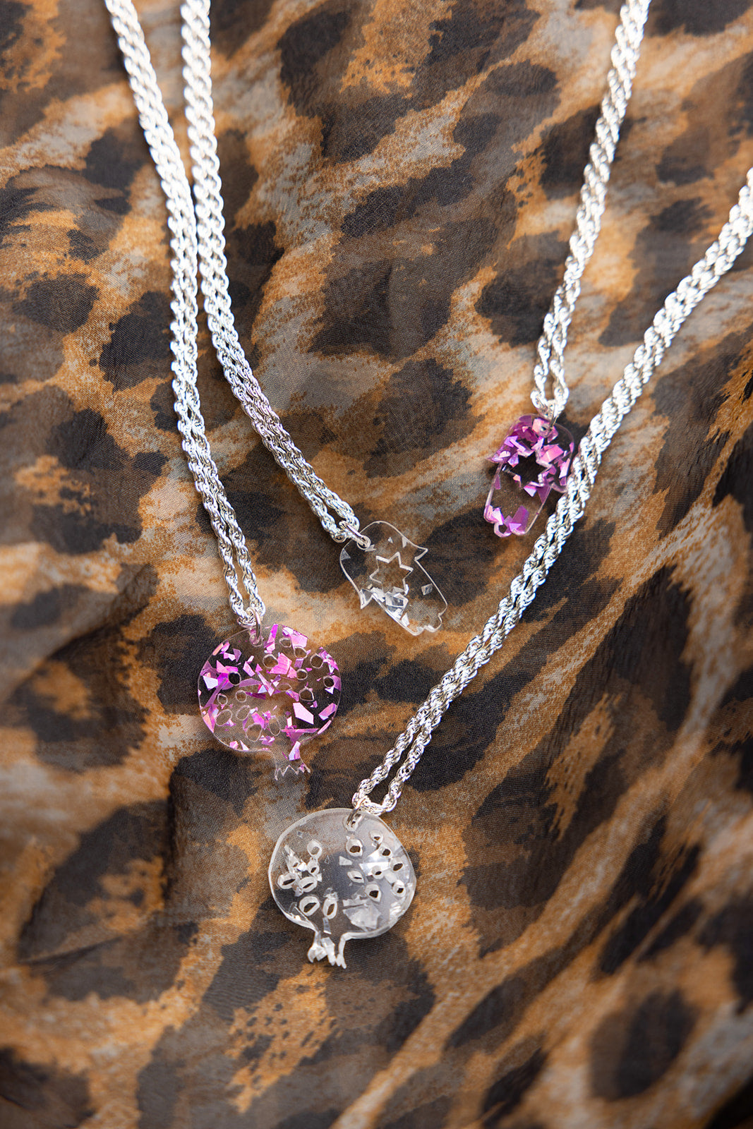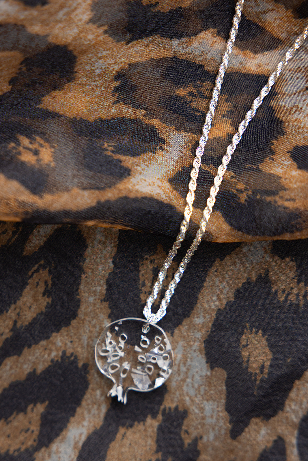 Add a touch of charm with the Yael Necklace, featuring a sleek silver-plated rope chain and a playful pomegranate pendant. Part of our new collection, it offers the same captivating style as our other necklaces but in a more affordable metal. Choose between a shimmering holographic pink fleck or a sparkling silver fleck pomegranate charm to suit your vibe and bring abundance to your day to day.